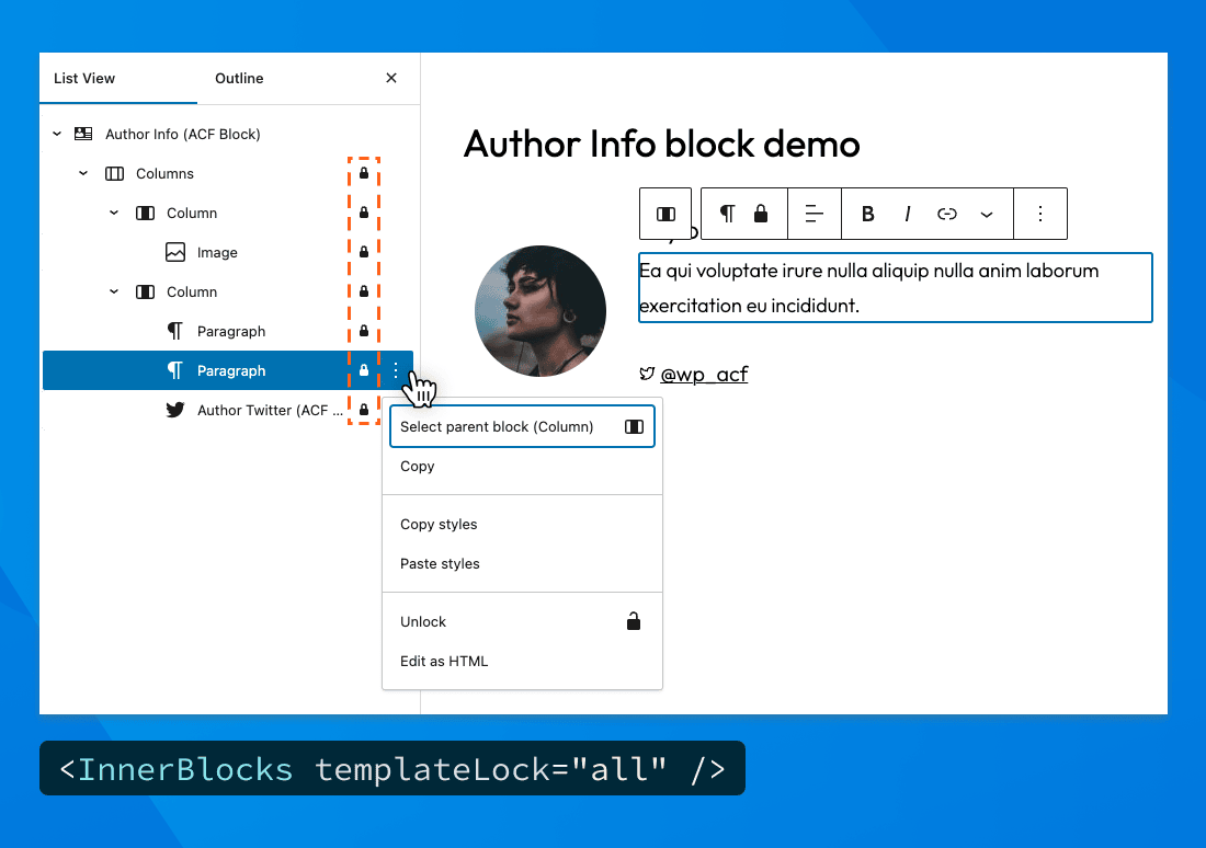 In our previous tutorial on using ACF Blocks with InnerBlocks and parent/child relationships, we built a custom Author Info block (parent). This custom ACF Block used InnerBlocks to pass a series of nested blocks, which included another custom Author Twitter block (child).